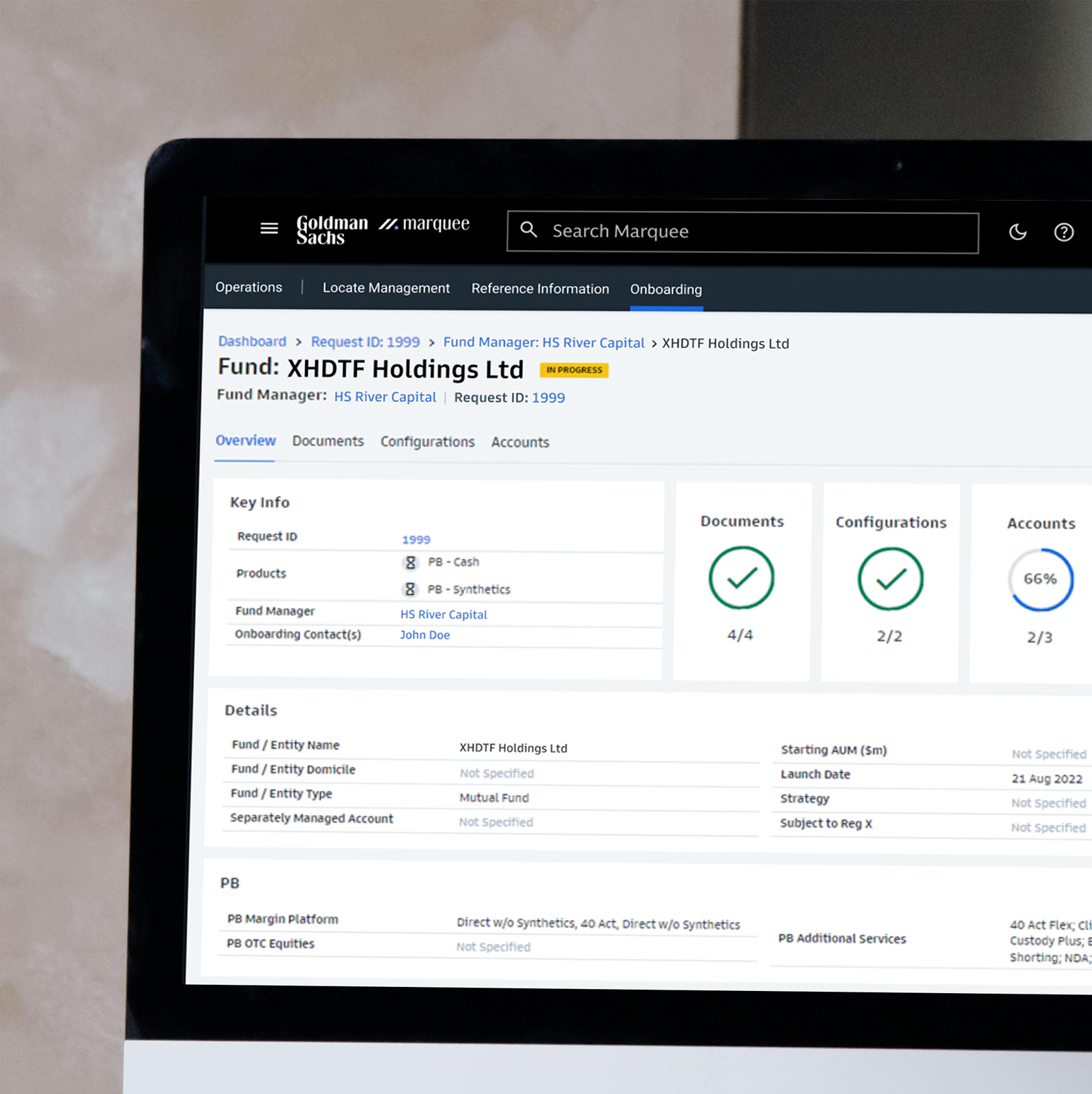 I currently co-lead product design for a suite of digital tools on Goldman Sachs’ Marquee platform serving Prime Services clients and internal teams. My work focuses on simplifying complex financial workflows into scalable, self-service experiences that strengthen client trust, improve internal team efficiency, and drive measurable impact. Operating within a highly regulated financial ecosystem, I design for clarity, security, and long-term platform scalability, aligning fragmented business lines and multiple stakeholders around a cohesive, client-centered experience.